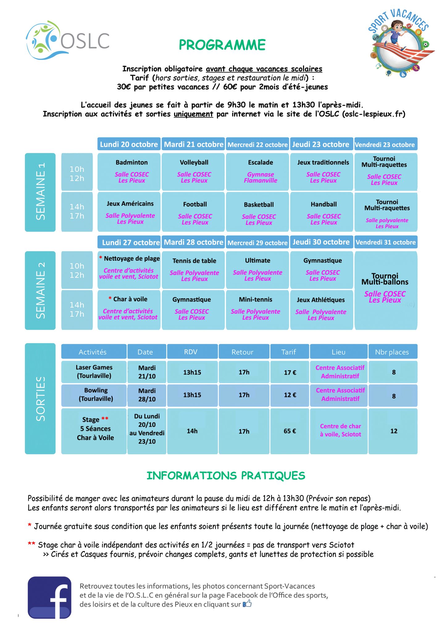 L’accueil débute tous les matins à 9h30 et à 13h30 les après-midis. Les lieux de rendez-vous varient en fonction de l’activité proposée : salle polyvalente, COSEC, stade municipal des Pieux, Sciotot, city-stade… Des sorties hors du territoire des Pieux sont également organisées pour que les enfants puissent découvrir des activités qui n’existent pas sur le canton. Les enfants ont aussi la possibilité de se restaurer avec les animateurs le midi (12h/13h30) de telle manière à rester aux activités de la journée complète. Pour cela, il suffit d'amener son repas du midi.